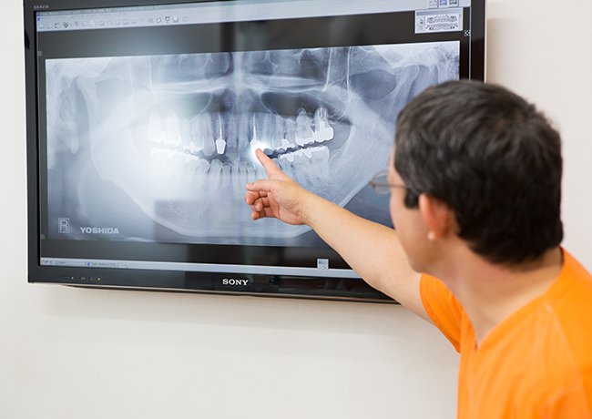 歯周病の検査や歯型をとり、残っている歯や噛み合わせについて細かく確認を行います。歯科用CTを使用して、顎の骨の密度や量、神経の位置を細かく検査します。